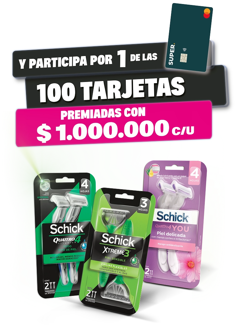 Puedes encontrar nuestros productos Schick a nivel nacional en supermercados de cadena, supermercados independientes, droguerías y miles de tiendas a nivel nacional.